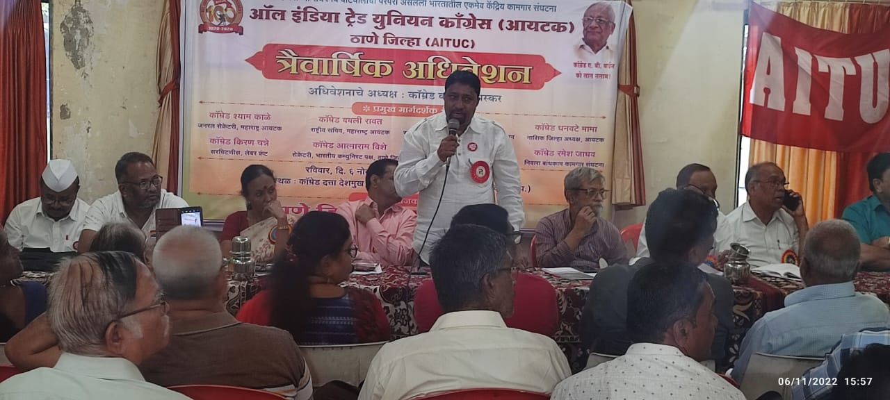 कल्याण : भारतातील राष्ट्रीय पातळीवरील प्रथम कामगार संघटना ऑल इंडिया ट्रेड युनियन काँग्रेस ठाणे जिल्हा अधिवेशन ठाणे जिल्ह्या आयटकचे अध्यक्ष कॉम्रेड काळू कोमस्कर यांच्या अध्यक्षतेखाली दत्ता देशमुख सभागृह कल्याण येथे आयोजित करण्यात आले होते. या समारंभाला प्रमुख पाहुणे म्हणून ऑल इंडिया ट्रेड युनियन काँग्रेसच्या राष्ट्रीय सचिव कॉम्रेड बबली रावत, राज्य आयटक सरचिटणीस कॉम्रेड श्याम काळे, महाराष्ट्र स्टेट इलेक्ट्रिसिटी वर्कर्स फेडरेशनचे सरचिटणीस कॉम्रेड कृष्णा भोयर, राज्य आयटक उपाध्यक्ष काँ.उदय चौधरी, नाशिक जिल्हा आयटक अध्यक्ष कॉ. व्ही. डी. धनवटे, वर्कर्स फेडरेशनचे उपसरचिटणीस अरुण मस्के, भारतीय कम्युनिस्ट पक्षाचे ठाणे जिल्हा सचिव कॉम्रेड आत्माराम विशे, निवारा बांधकाम कामगार संघटना कॉ. रमेश जाधव, कामगार नेते अरविंद तापोळे उपस्थित होते.