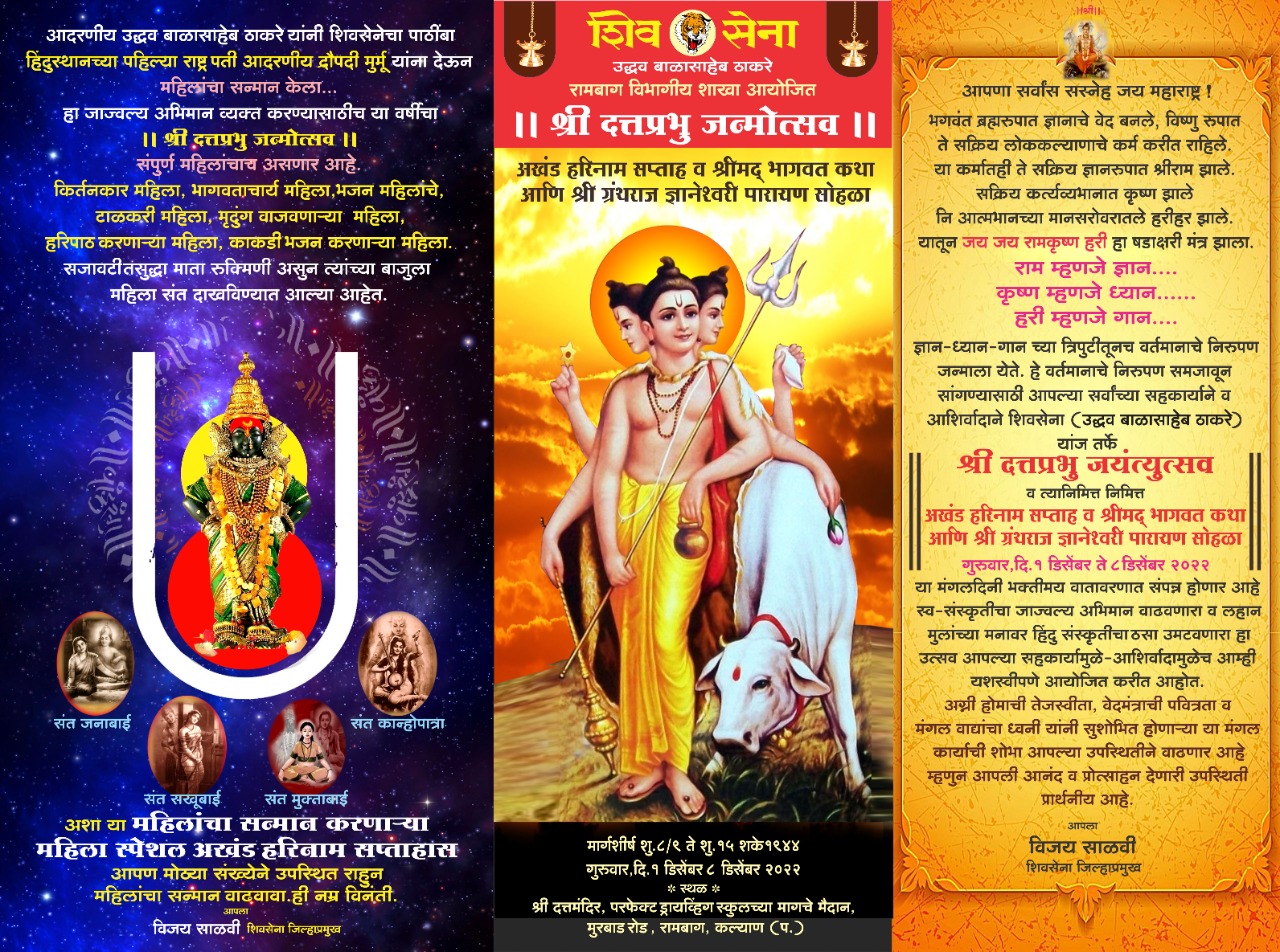 दररोज महिलांचे काकड्याचे भजन, ज्ञानेश्वर पारायण, भजन, भागवत कथा, सामुदायिक हरिपाठ, कीर्तन, हरिजागर होईल. दत्तमंदिर, परफेक्ट ड्रायविंग स्कूलच्या मागील मैदानात, मुरबाड रोड, रामबाग कल्याण पश्चिम याठिकाणी हा सोहळा होणार आहे. तर राष्ट्रपती निवडणुकीत शिवसेना पक्षप्रमुख उद्धव ठाकरे यांनी द्रौपदी मुर्मू यांना पाठींबा देऊन महिलांचा सन्मान केला होता. त्यामुळे महिला राष्ट्रपती आहेत याचा अभिमान व्यक्त करण्यासाठी दत्त जयंती उत्सवानिमित्त शिवसेना रामबाग विभागीय शाखेच्या वतीने अखंड हरीनाम सप्ताह आयोजित केल्याचे जिल्हाप्रमुख विजय साळवी यांनी सांगितले.
