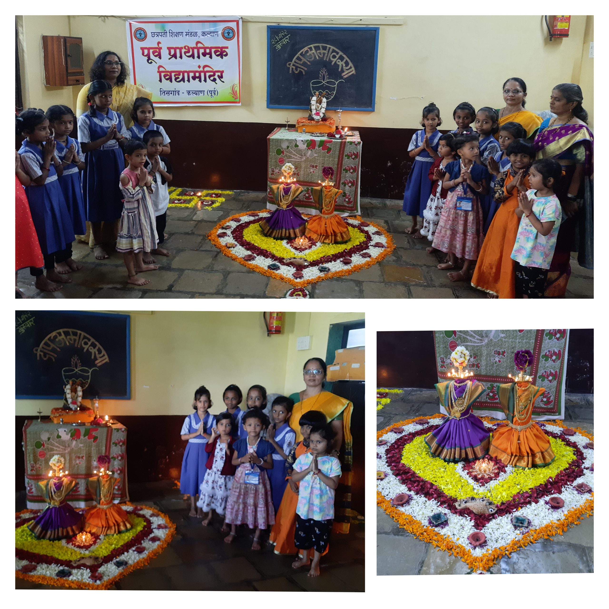 शाळेमध्ये विविध आकाराच्या व बहुरंगी पणत्या आणि दिव्यांची आरास करण्यात आली होती. तसेच सरस्वतीचे पूजन देखील करण्यात आले होते. विशेष म्हणजे शाळेत पूजनासाठी ठेवण्यात आलेल्या समईना सुंदर साडी नेसवून दागिन्यांनी सजवण्यात आले होते. हि सुंदर अशी समई सर्वांचा आकर्षणाचा केंद्रबिंदू ठरली. शाळेतील लहान मुलानी दिव्यांची सजावट पाहण्यासाठी एकच गर्दी केली होती. तर विद्यार्थ्यांच्या पालकाना देखील मोह आवाराला नाही.